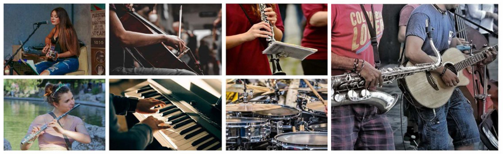 Chant, violoncelle, clarinette, guitare, trompette, flûte traversière, piano, batterie et une formule-atelier pour jouer ensemble