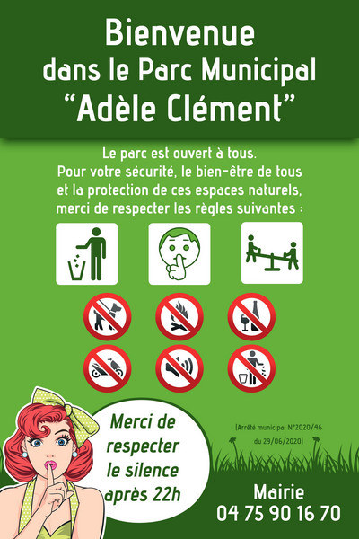 Afin de rendre l’utilisation du parc possible par tous, la Municipalité a pris un arrêté réglementant l’accès au parc municipal ‘’Adèle Clément’’ (cf Arrêté N° 2020/46 ci-joint).