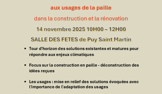 Réunion d'information et de sensibilisation aux usages de la paille 06/11/2025 Vie citoyenne La commune et Montelimar-Agglomératiion le 14 novembre 2025 à la salle des fêtes de Puy-Saint-Martin