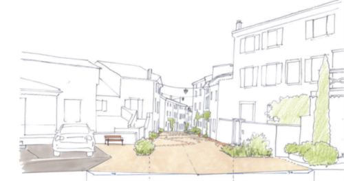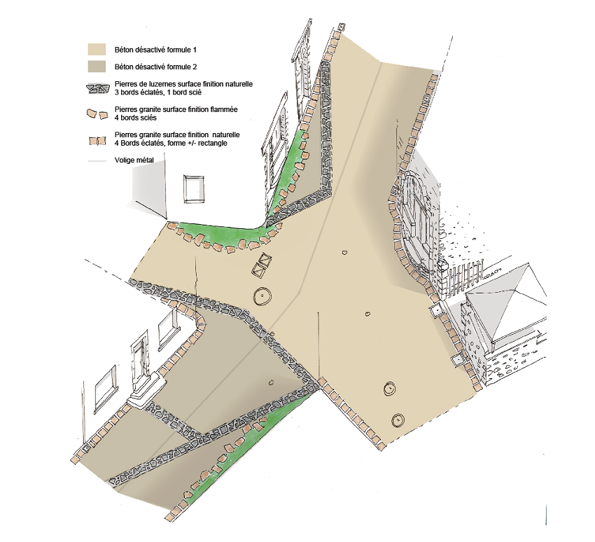 Des marquages en pierres grises viendront souligner l’emplacement des anciennes bâtisses rasées lors de la création de la route départementale.